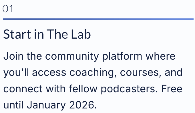 Inside The Lab, you'll find weekly coaching replays, resource vaults, community forums, and the foundation for both specialty tracks. This is where your podcast business begins — where clarity turns into consistent progress.